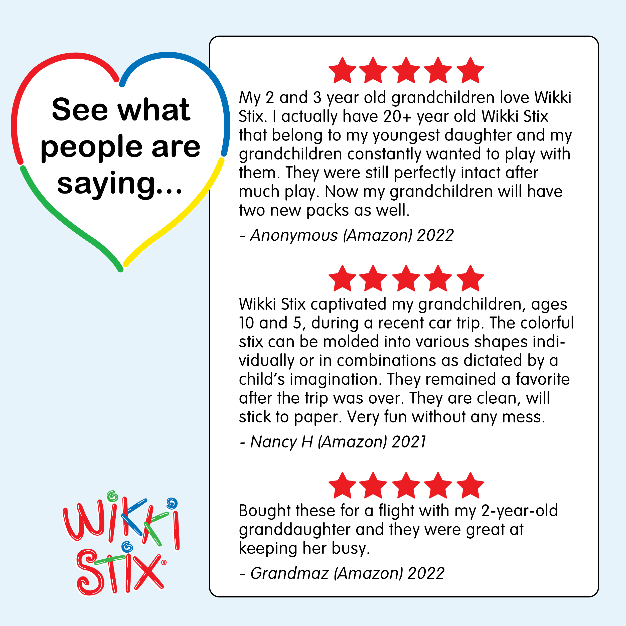 American-made Wikki Stix are a molding toy made from knitting yarn and non-toxic wax that can be shaped into just about anything. Fun socks or sunglasses. 15 Wikki Stix premium paks each with 12 6-inch colorful Wikki Stix and a fun connect-the-dot activity sheet to be completed with Wikki Stix.